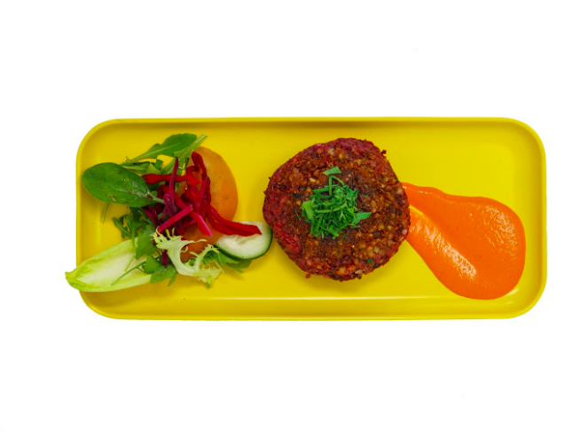 BURGER D’ARRÒS NEGRE I AZUKIS AMB PATATES AL FORN, SOJANESA DE TAMARI I PA CRISTALL