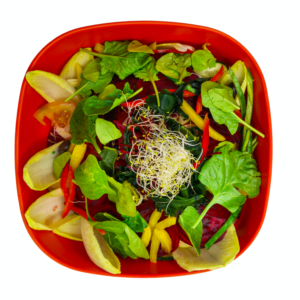 BUDA BOL CON HOJAS VERDES, MIJO, TOMATE SECO, GERMINADOS, BRÓCOLI Y TEMPEH CRUJIENTE