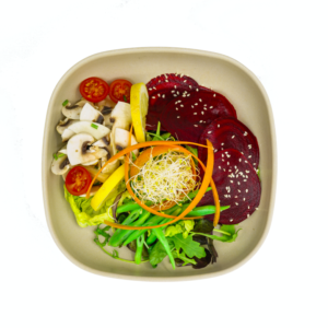 ENSALADA VERDE CON RÚCULA, CALABAZA Y REMOLACHA RAW Y QUESO DE CABRA