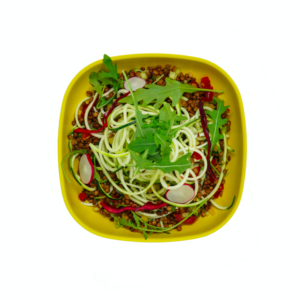 GREEN SALAD WITH ZUCCHINI SPAGHETTI, BEETROOT, CHEESE AND SEEDS MIX