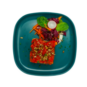 MEDITERRANEAN GREEN SALAD WITH ROASTED AUBERGINE, TOFU, SUN-DRIED TOMATO AND OLIVES