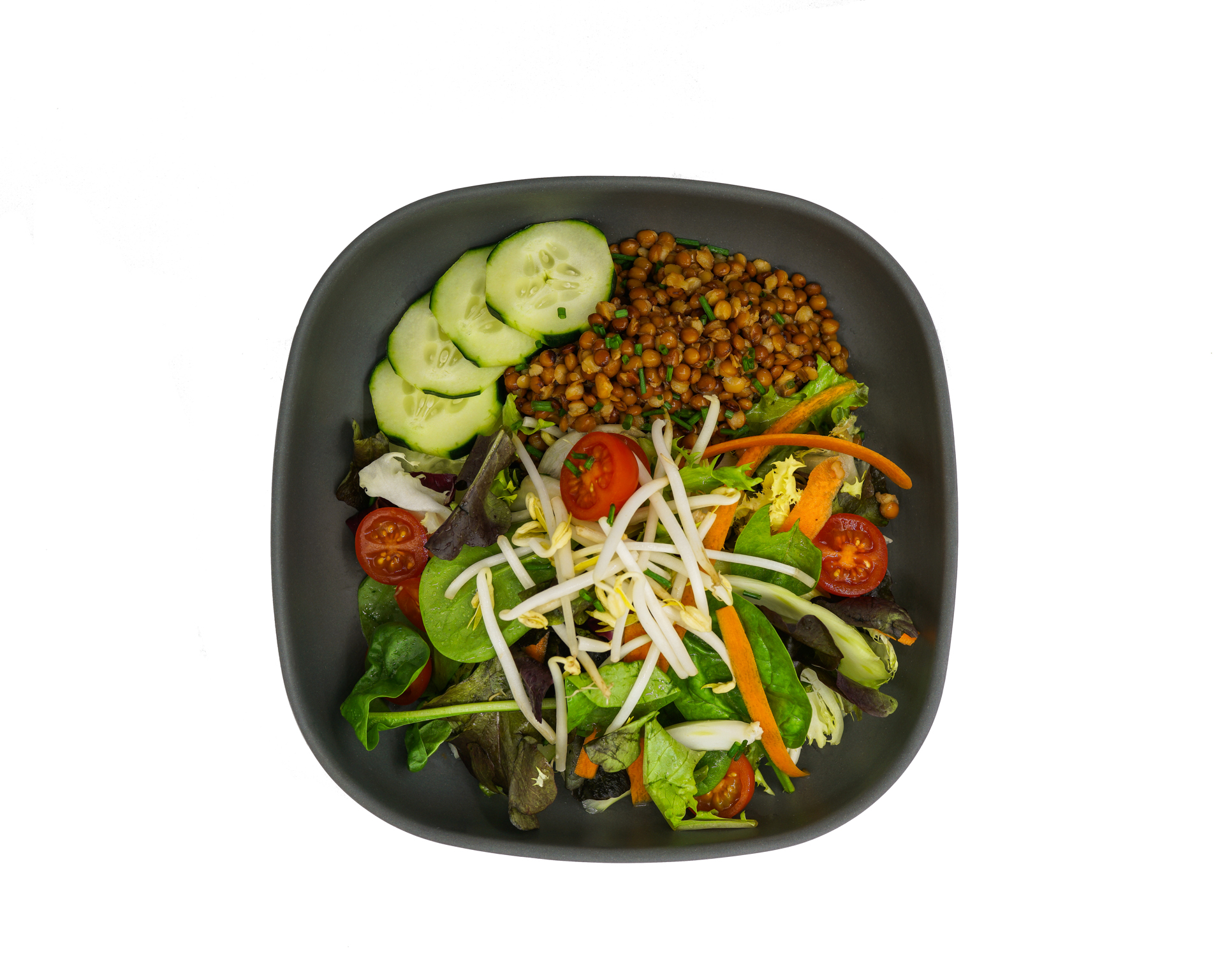 ENSALADA VERDE CON LENTEJAS, ZANAHORIA, QUESO FETA Y OLIVAS