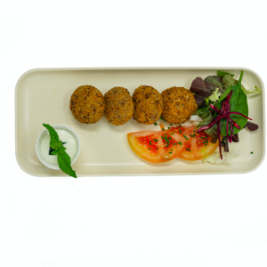 ALBÓNDIGAS DE QUINOA Y JACKFRUIT CON “PICO DE GALLO” Y SALSA DE GUISANTES